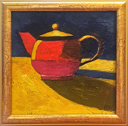 obraz namalowany farbami akrylowymi na płycie wielkości 15 x 15 cm, oprawiony, rozmiar zewnętrzny ramy 17 x 17 cm