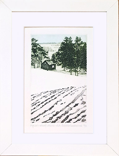 grafika wielkości 7,5 x 12 cm, oprawiona w prostą białą ramkę, za szkłem, rozmiar zewnętrzny 15 x 20 cm