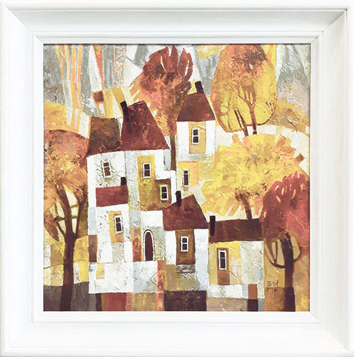 obraz wielkości 37 x 37 cm, namalowany na płycie pilśniowej farbami akrylowymi. Posiada piękną, wyraźną fakturę, pokryty satynowym werniksem, oprawiony w drewnianą, pomalowaną na biało ramę, rozmiar zewnętrzny oprawy 46 x 46 cm